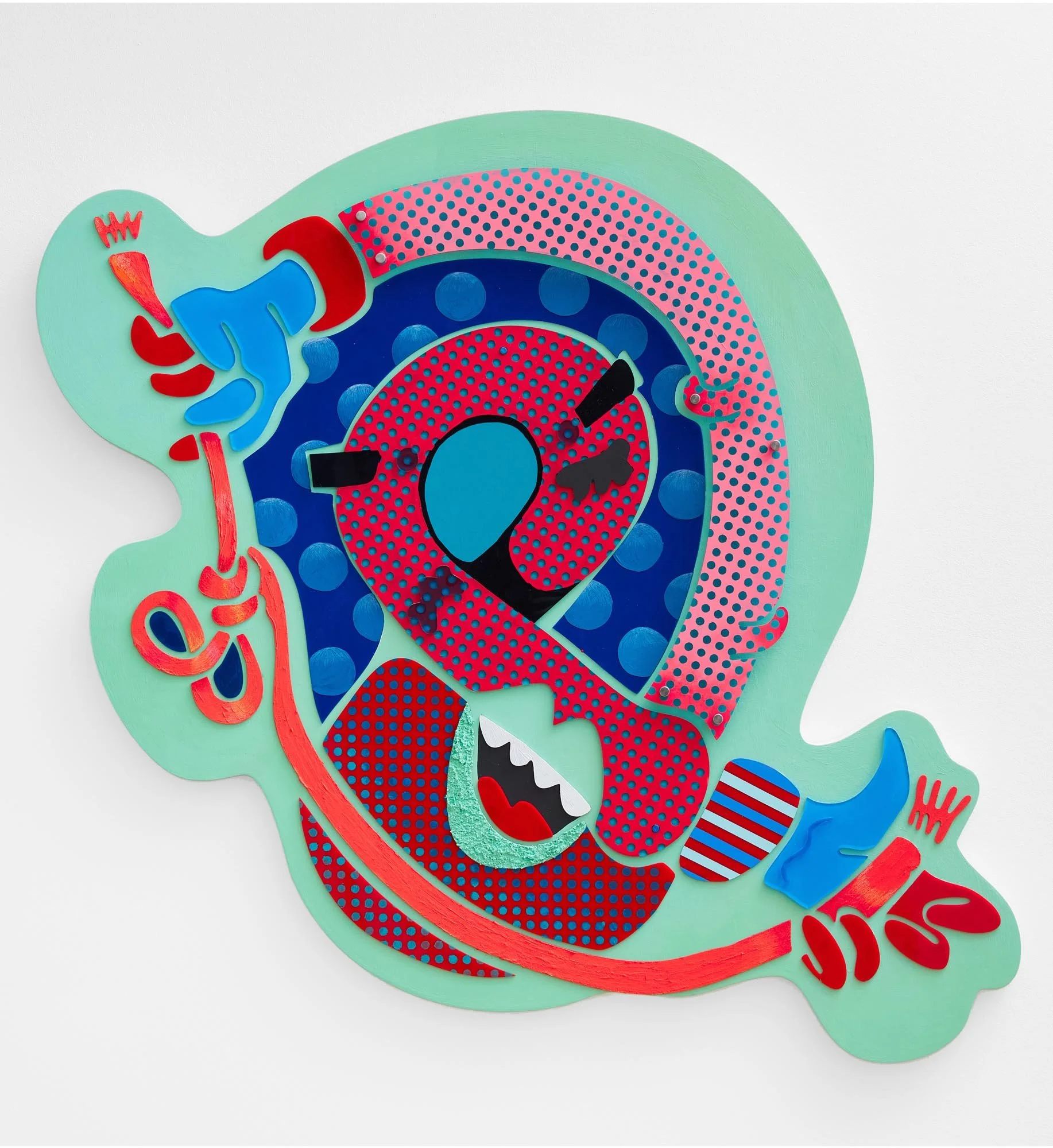 Acrylic paint and screenprint on acrylic sheet, wood parts, laminated on wood panel